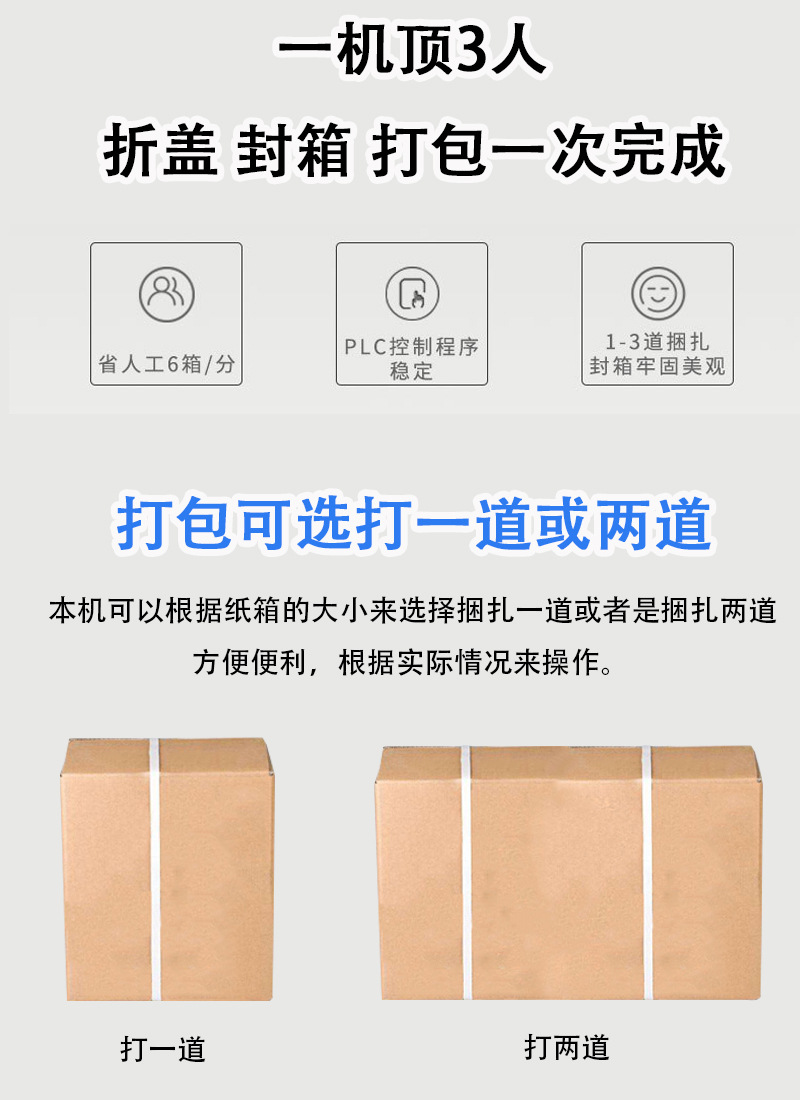 - 由于實現了高度自動化,減少了人工參與封箱打包的操作環節,從而節省了大量時間。原本人工封箱和打包需要花費較多時間來完成諸如折頁、貼膠帶、纏繞打包帶等步驟,而機器可以在短時間內自動完成。同時,人工操作容易出現失誤,如膠帶粘貼不牢固、打包帶松弛等,這些失誤會導致返工,降低工作效率。一字封箱打包機通過精準的機械控制和自動化流程,有效避免了這些人工失誤,保證了包裝質量,間接提高了工作效率