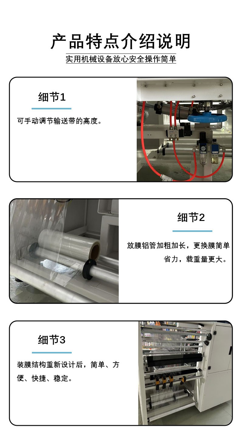 - 產品尺寸:當包裝物尺寸變更時,調整非常簡單,無需更換模具與袋器,通過手柄伸縮或其他調節方式即可適應不同大小的產品,還可搭配組合不同規格產品進行包裝,如密接型伸縮型封切機可包裝小產品、集合組合小規格產品。