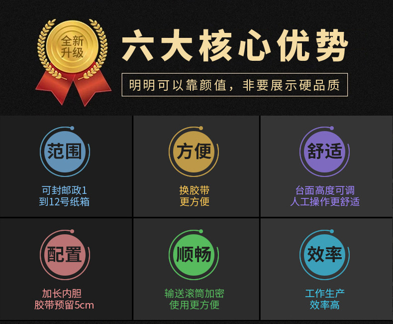 膠帶輸送機構(gòu):主要由多個滾輪和導(dǎo)向桿組成。膠帶從膠帶卷引出后,經(jīng)過這些滾輪和導(dǎo)向桿,被輸送到紙箱封口處。其中一些滾輪是帶有壓力的,用于將膠帶緊密地貼合在紙箱上。在膠帶輸送過程中,會有相應(yīng)的裝置來控制膠帶的輸送長度,以適應(yīng)不同尺寸紙箱的封箱需求。