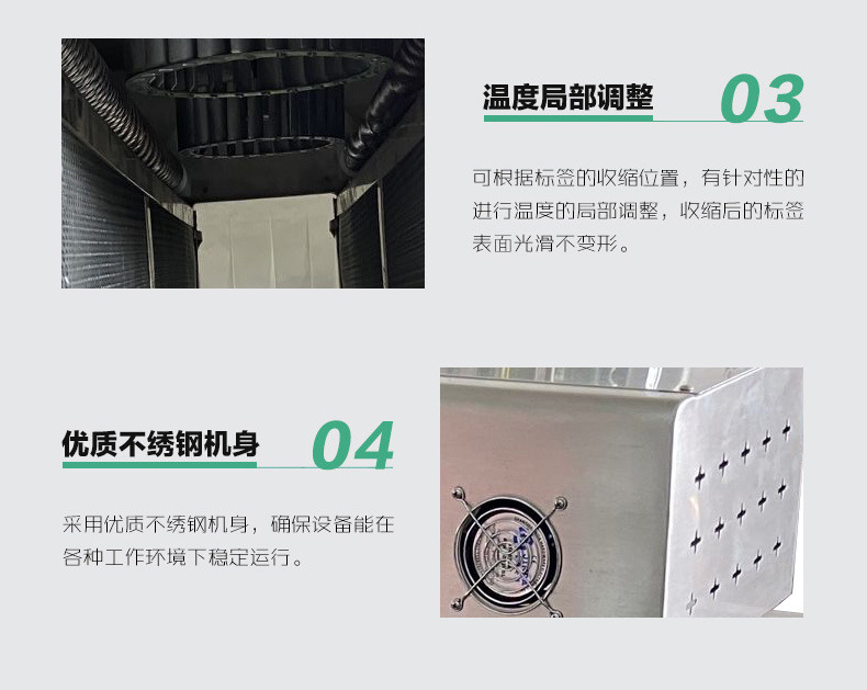 - 能夠精確控制加熱溫度和時間,使標簽膜緊密貼合在產品表面,避免出現褶皺、氣泡等包裝缺陷。收縮后的標簽膜表面光滑、平整,提升了產品的整體外觀形象。