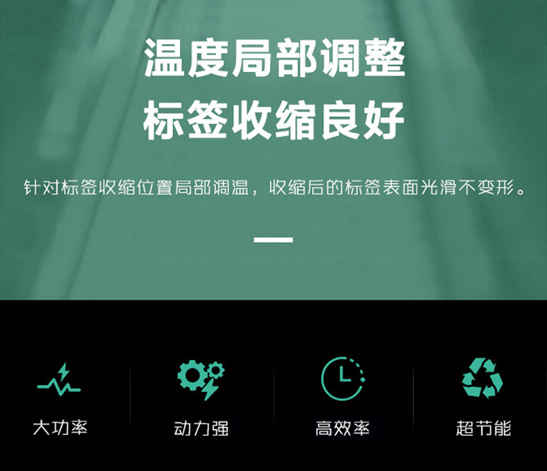 - 電加熱方式具有較高的熱效率,相比其他加熱方式(如蒸汽加熱),能夠更快地使標簽膜達到收縮溫度。并且,通過精確的溫度控制和優化的加熱單元設計,可以減少不必要的熱量損失,降低能源消耗。