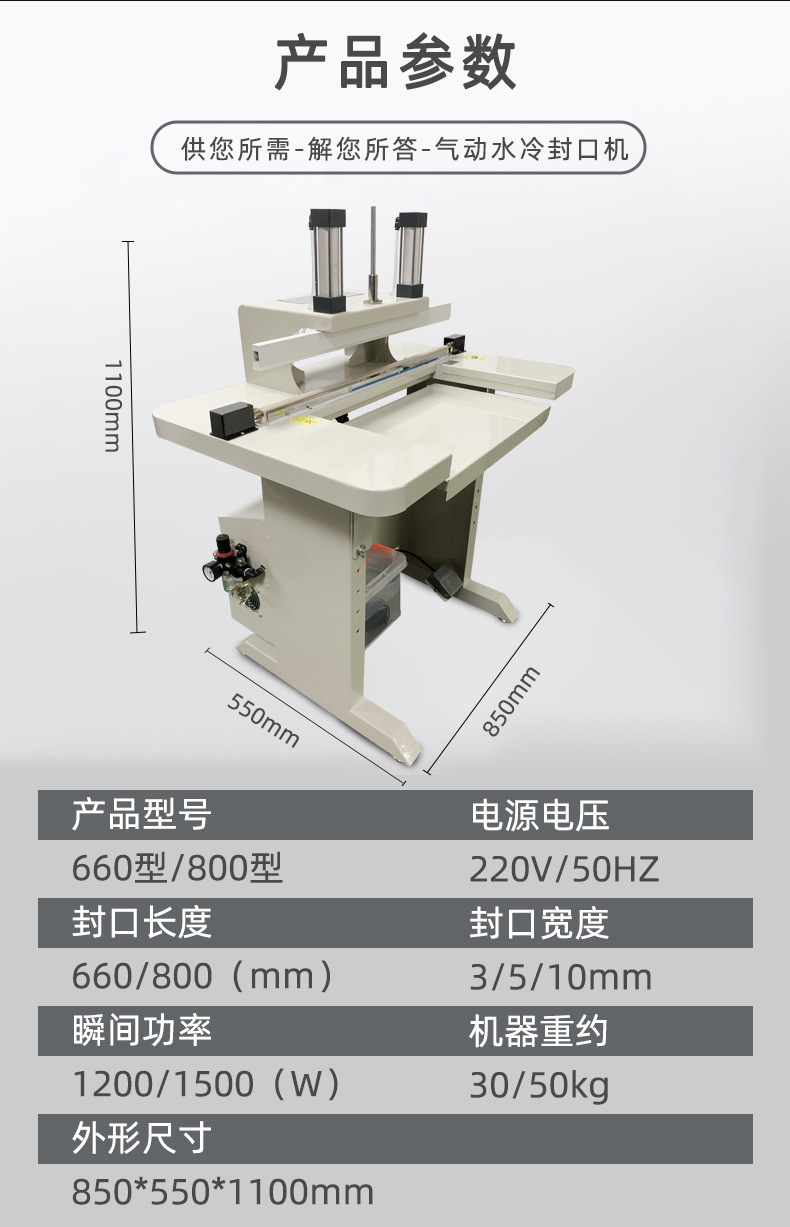 - 適用廣度無(wú)可比擬:從材質(zhì)維度,塑料、紙質(zhì)、復(fù)合材質(zhì)包裝袋都能精準(zhǔn)封口;論及厚度,薄如蟬翼的保鮮膜到厚重的防潮袋,它都胸有成竹。化工原料包裝需耐腐、醫(yī)藥試劑包裝求無(wú)菌,調(diào)整參數(shù)后,水冷封口機(jī)皆可滿足。