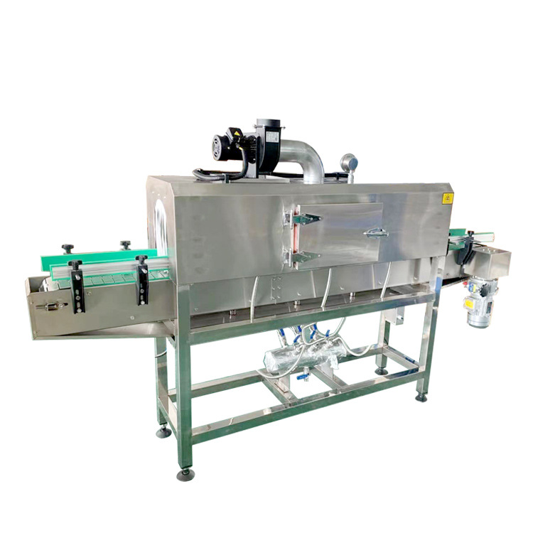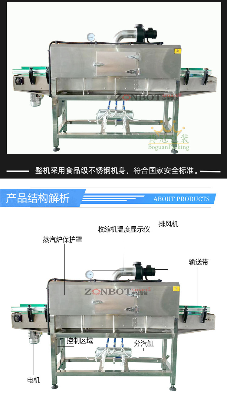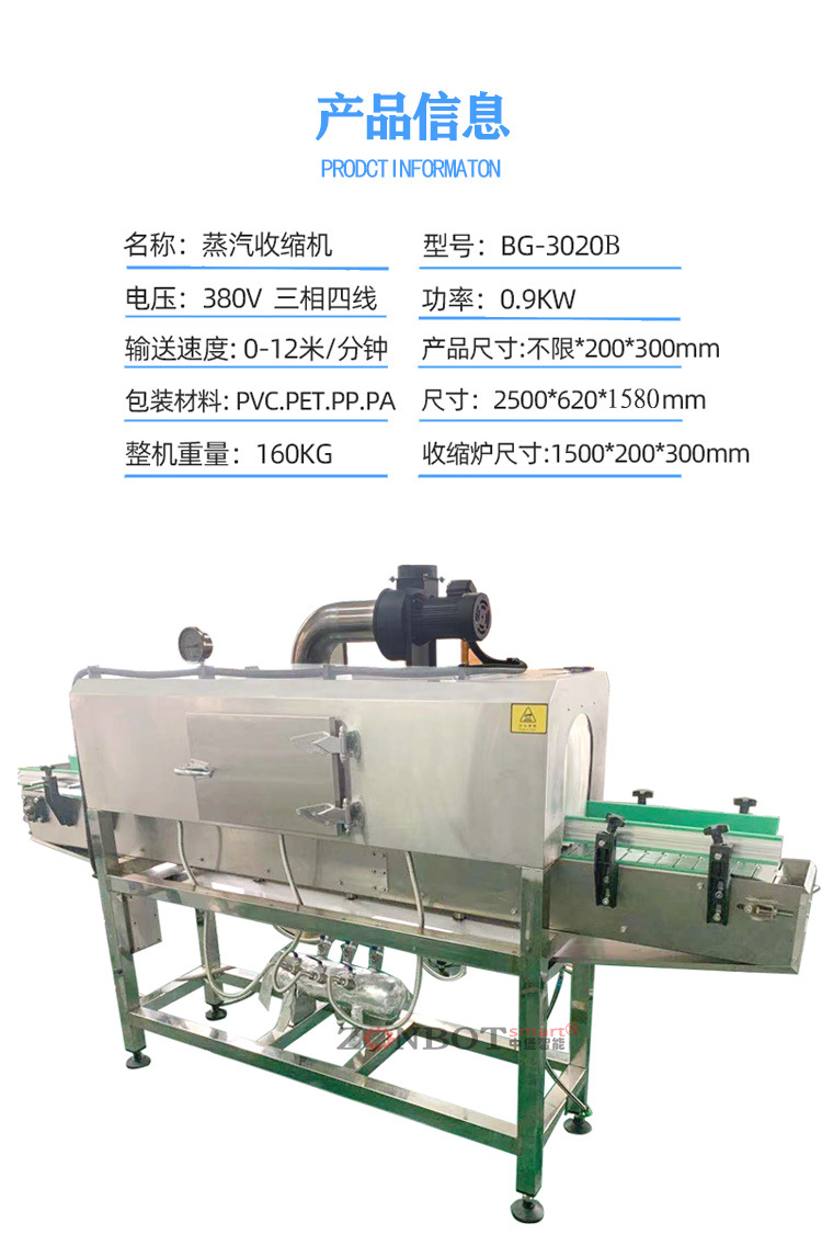 - 物品輸送方式:蒸汽收縮機(jī)采用勻速的輸送網(wǎng)帶或輸送鏈來(lái)傳送包裝物品通過(guò)收縮腔室。這樣可以保證物品在收縮過(guò)程中以穩(wěn)定的速度經(jīng)過(guò)蒸汽作用區(qū)域,每個(gè)部位接受蒸汽加熱的時(shí)間基本相同,從而避免了因停留時(shí)間不同而導(dǎo)致的收縮不均勻問(wèn)題。