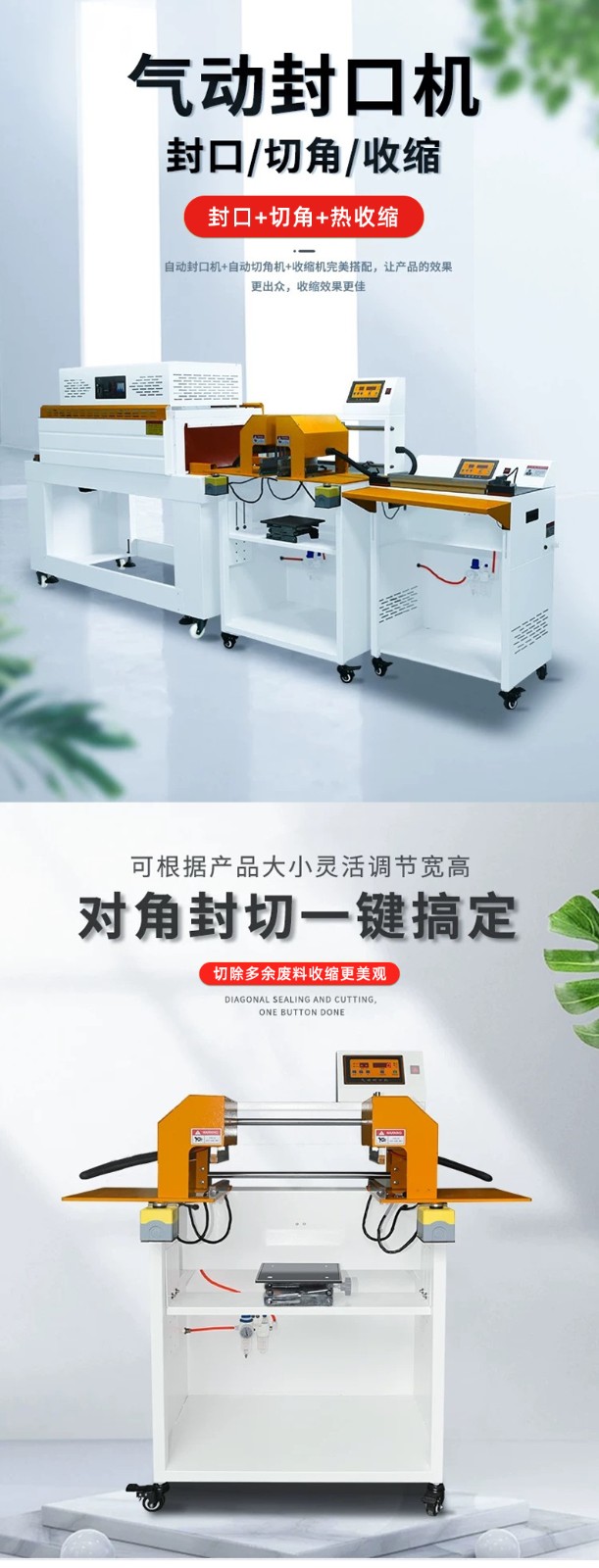 氣動封口切角熱收縮機具備高度自動化的運作機制,能夠一氣呵成地自動完成送料、封口、切角、熱收縮等一系列緊密相連的包裝工序。在送料環(huán)節(jié),設(shè)備配備了精準(zhǔn)的自動送料裝置,該裝置可依據(jù)預(yù)設(shè)程序,持續(xù)且穩(wěn)定地將待包裝產(chǎn)品精準(zhǔn)無誤地輸送至指定位置,無需人工頻繁手動上料,極大地降低了人力投入與勞動強度。