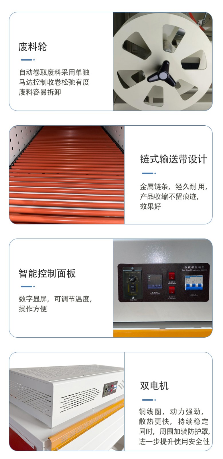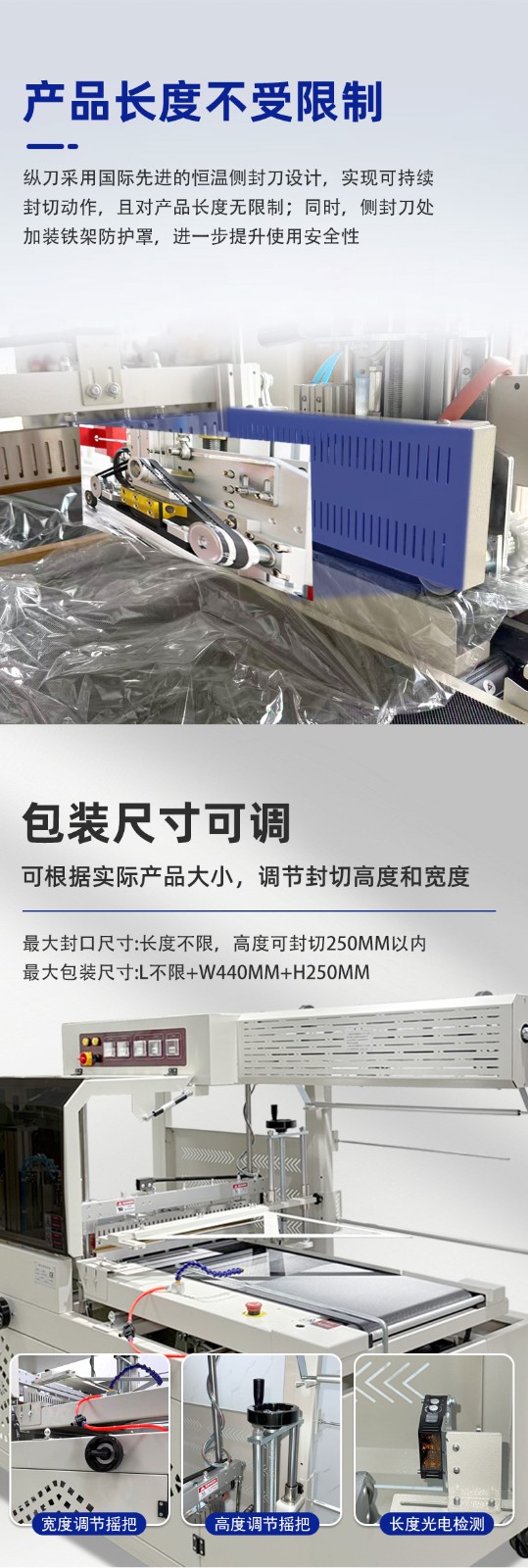 其適用范圍廣的核心邏輯是結構兼容性強、薄膜適配性高、尺寸調節靈活,能應對不同形態、尺寸、材質的產品包裝需求: