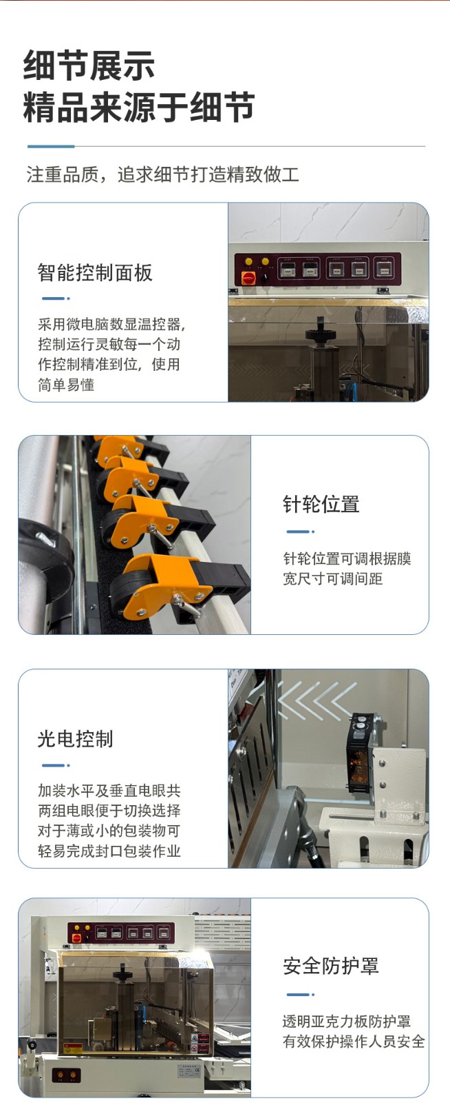 3. 自動化保護機制,保障運行穩定性設備內置多重智能保護功能:當薄膜用盡時,機器會自動停機并報警;封切刀溫度異常(過高 / 過低)時,系統會實時監測并觸發保護,防止薄膜燙破或封合不牢固;進料口無產品時,送膜與封切工序會同步暫停,避免空膜浪費。這些自動化保護不僅減少設備故障風險,也降低了人工巡檢的頻率,提升設備連續運行的可靠性。