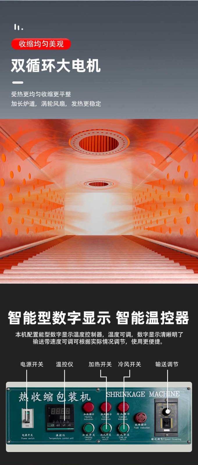 批量生產對設備的連續運行能力要求極高,袖口式熱收縮包裝機通過三大設計確保穩定性:其一,采用重型鋼結構機身,搭配精密軸承與耐磨輸送帶,長期運行后機身無明顯晃動,輸送帶磨損率降低 60%,使用壽命可達 3-5 年;其二,搭載進口 PLC 控制系統與伺服電機,核心部件故障率低于 0.3%,可支持 24 小時連續作業,即使在食品飲料行業 “旺季日產 10 萬瓶” 的高強度生產場景下,也能保持穩定運行;其三,配備完善的保護機制 —— 當加熱管溫度異常、包裝膜斷膜、輸送帶卡瓶時,設備會自動切斷電源或暫停運行,并在觸控屏上顯示故障原因,操作人員可快速排查維修,平均停機維修時間控制在 15 分鐘以內,大幅減少因設備故障導致的產能損失。