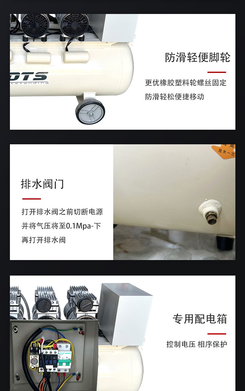 內部壓縮腔無潤滑油參與,依靠自潤滑材料(如石墨、PTFE 涂層、陶瓷部件)或水潤滑實現活塞 / 轉子的運轉。壓縮后的空氣不含油霧、油蒸氣,潔凈度高,可直接用于對氣體純度有要求的場景。