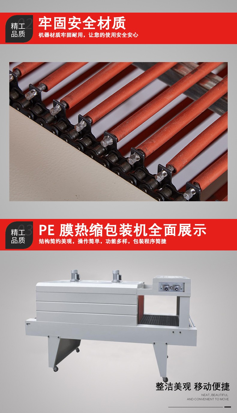 它主要是利用熱收縮薄膜在受熱時會產生收縮的特性來對產品進行包裝。當包裝好產品的熱收縮薄膜被送入熱收縮機的加熱通道后,熱空氣均勻地包裹薄膜,使薄膜分子活動加劇,從而產生收縮,緊密地貼合在產品表面,達到良好的包裝效果。