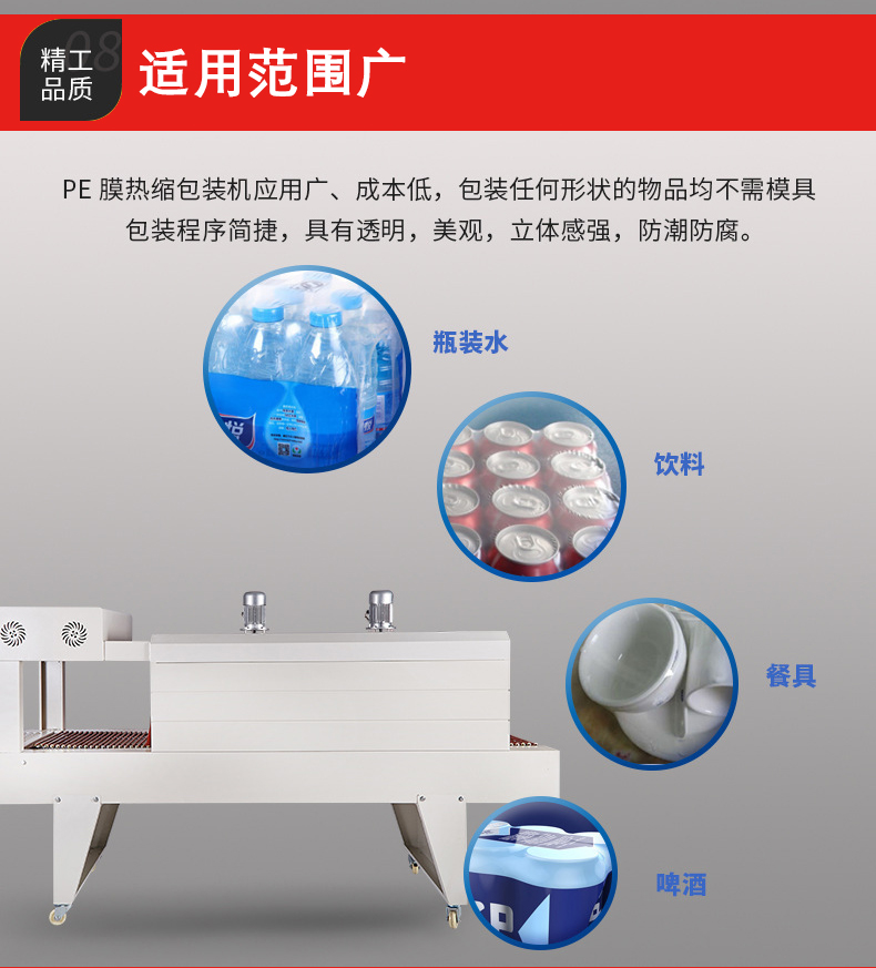 熱收縮包裝后的產品外觀整潔、美觀,薄膜能夠緊密貼合產品,凸顯產品的輪廓,提升產品的整體形象,對產品有很好的展示效果。