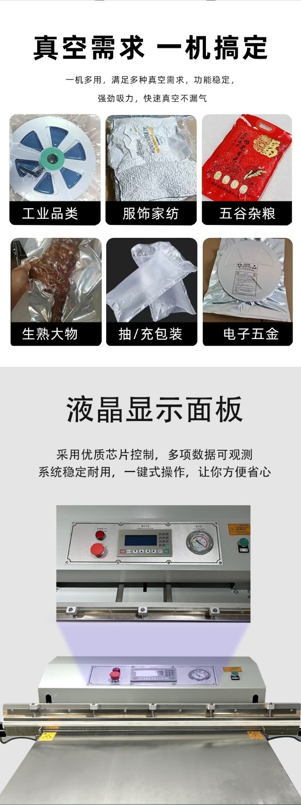 - 氣動外抽真空包裝機的抽氣口在包裝機外部,通過外接的抽氣管道對包裝袋進行抽氣。而內抽式真空包裝機是將包裝袋放入機器內部的真空室進行抽氣。外抽式的優勢在于可以對不同尺寸和形狀的包裝袋進行靈活抽氣,不受真空室大小的限制。例如,對于一些體積較大、形狀不規則的產品包裝,如大型的電子設備、長條形的工業零部件等,外抽式更能發揮其優勢。內抽式則更適合尺寸相對固定、批量較大的產品包裝,因為其內部真空室的尺寸是固定的,對于形狀和大小差異較大的包裝可能不太方便。