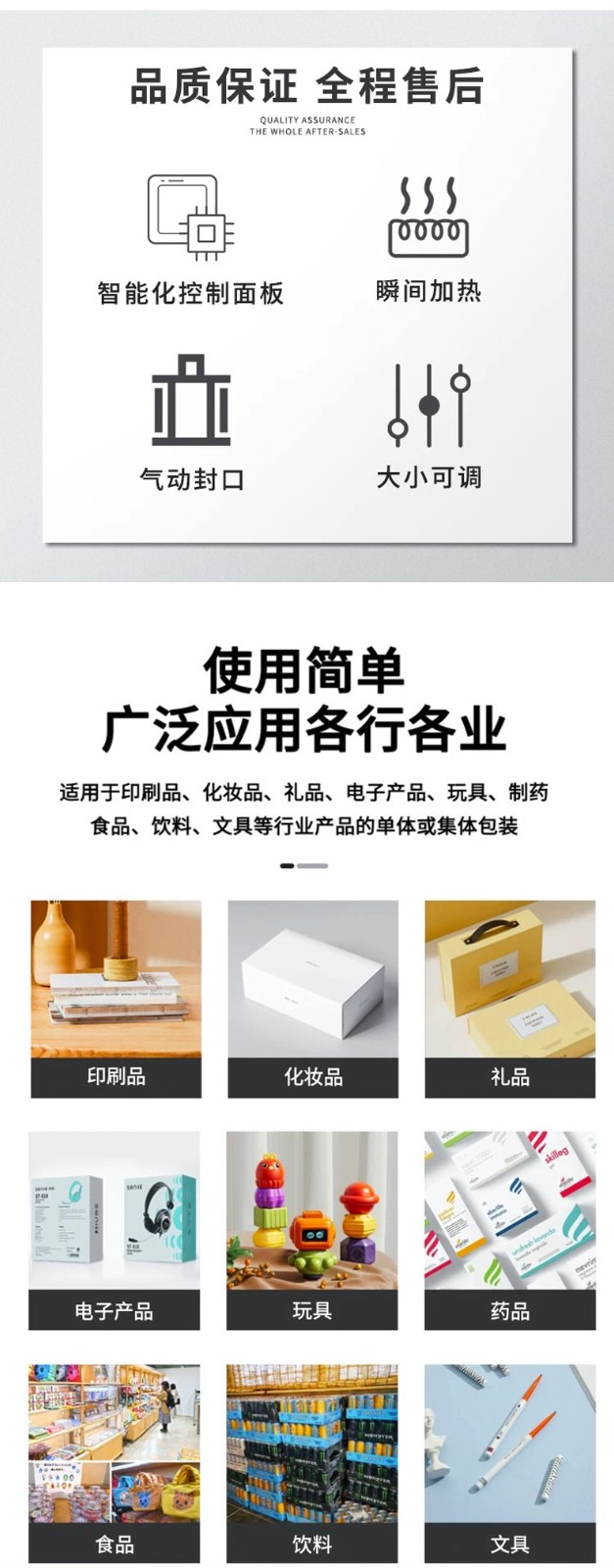 • 適應性強:可適應多種材質和規格的塑料薄膜,如 PVC、PE、PP 等,并且能夠根據不同產品的尺寸和包裝要求,調整封口長度、切角大小、熱收縮溫度和時間等參數,具有較強的通用性。