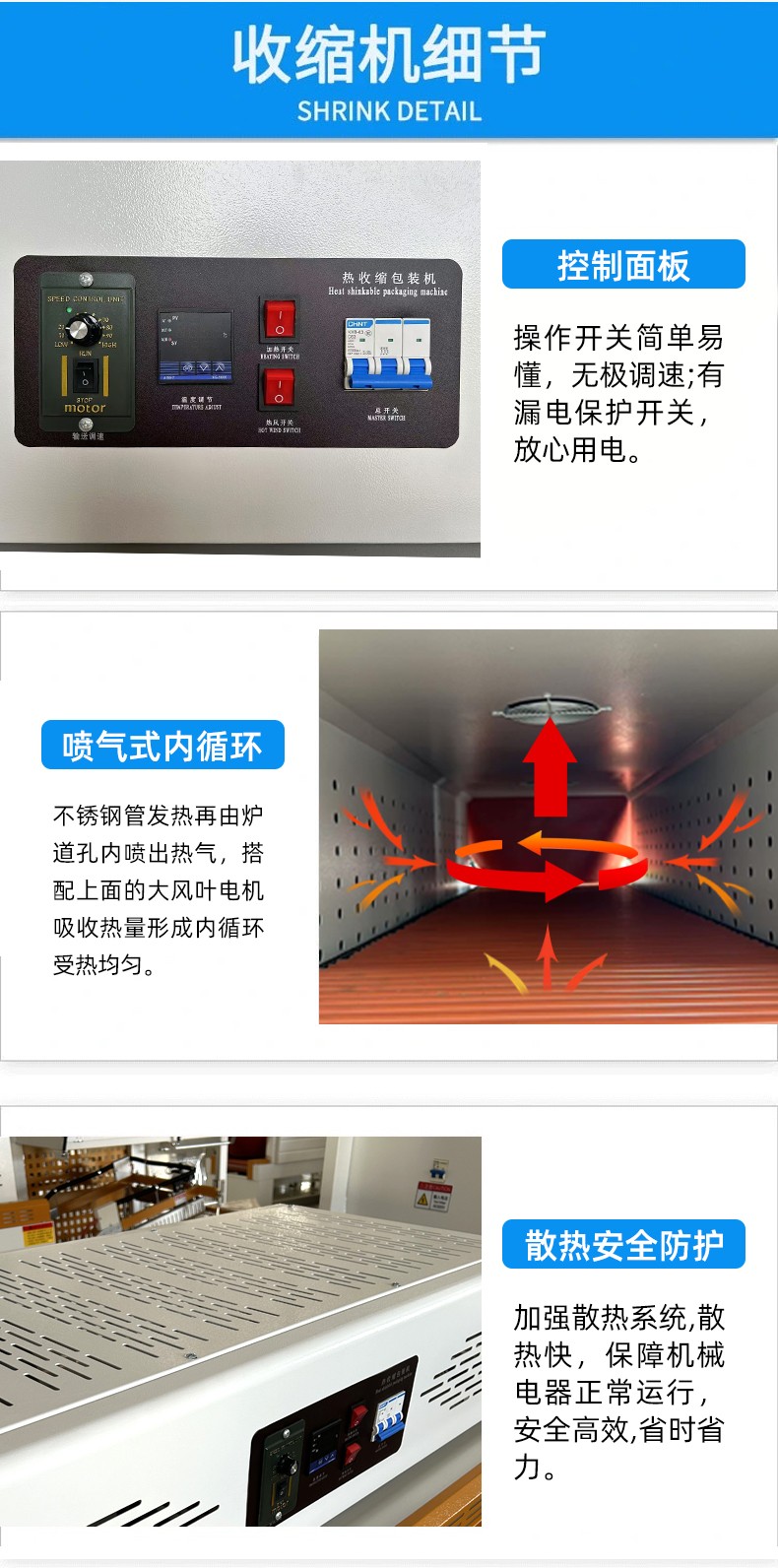 • 熱收縮通道:是一個具有加熱功能的通道,內部設有加熱管和循環風扇。產品通過輸送裝置進入熱收縮通道,在高溫熱風的作用下,包裝袋實現熱收縮。