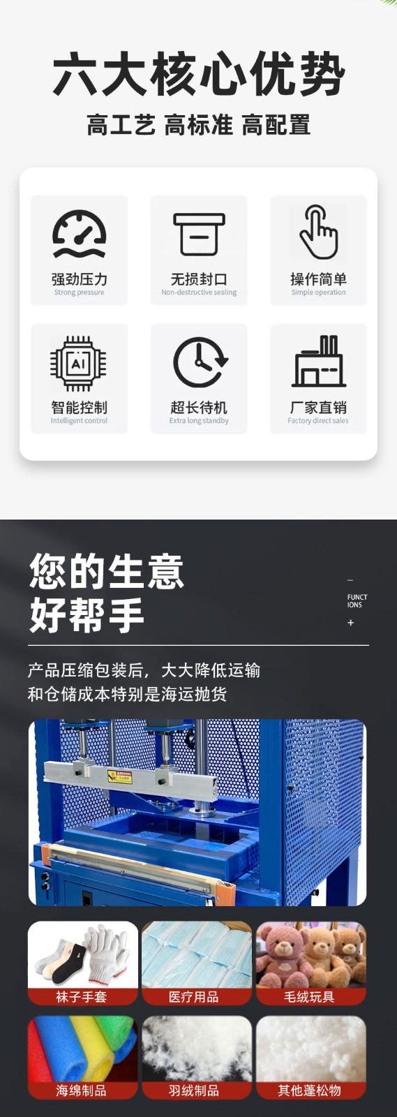 - 高效多功能:能在一臺設備上完成壓縮、真空和封口三道工序,大大提高包裝效率,同時適用于多種類型的物品和包裝材料。