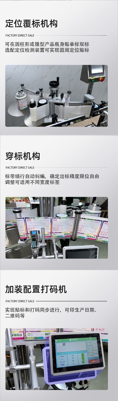 - 分瓶:分瓶機構對圓瓶進行等距分隔,使每個圓瓶以一定的間隔進入貼標和打碼區域,確保每個瓶子都能得到準確的處理。