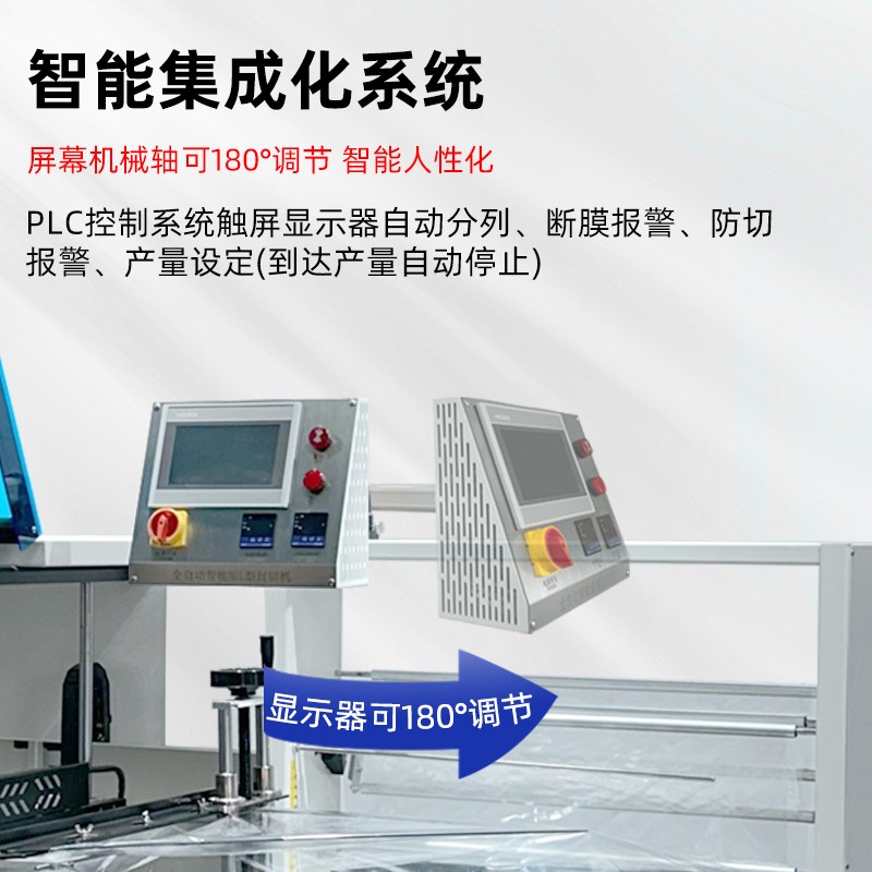 存放熱收縮膜卷(如 POF、PVC、PE 膜),配備自動(dòng)張力控制器,確保膜材勻速、平穩(wěn)輸送,避免膜材褶皺或斷裂(部分機(jī)型支持 “雙膜卷切換”,減少換膜停機(jī)時(shí)間)。 - 垂直封切機(jī)構(gòu):