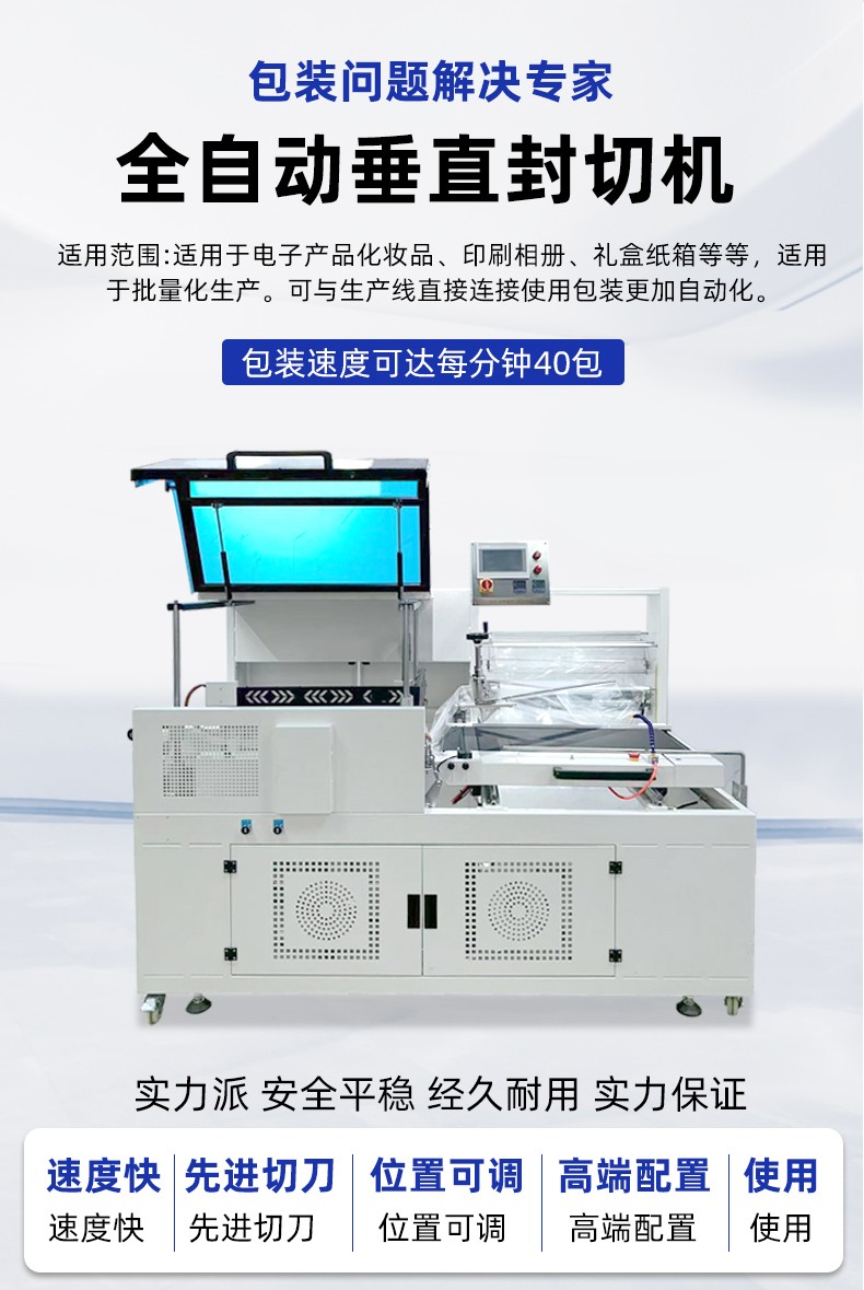 全自動(dòng)垂直封切熱收縮包裝機(jī)是一款集 “自動(dòng)封切” 與 “熱收縮定型” 于一體的高效包裝設(shè)備,核心優(yōu)勢(shì)在于垂直方向完成封切動(dòng)作,適配多尺寸、多形態(tài)產(chǎn)品,且包裝后能形成緊密、規(guī)整的保護(hù)膜,兼具防護(hù)性與美觀性,廣泛應(yīng)用于食品、醫(yī)藥、日化、電子等多個(gè)行業(yè)。以下從核心結(jié)構(gòu)、工作原理、關(guān)鍵優(yōu)勢(shì)、適用場景及選型注意事項(xiàng)五個(gè)維度,全面解析該設(shè)備: